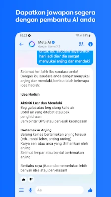 Tingkatkan kualiti komunikasi anda dengan ciri-ciri inovatif Messenger. Kongsi visual yang memukau dengan gambar definisi tinggi, abadikan memori dalam album kongsi yang mudah dicipta, atau hantar dokumen penting bersaiz sehingga 100MB terus dalam sembang. Perlukan bantuan atau inspirasi? Meta AI sedia menjadi pembantu peribadi anda, menjawab pertanyaan, memberi nasihat, mencetuskan idea kreatif, dan membantu dengan tugasan. Nikmati kawalan penuh ke atas perbualan dengan keupayaan menyunting mesej sehingga 15 minit selepas dihantar, atau pilih untuk menetapkan mesej supaya hilang selepas dibaca demi privasi tambahan.