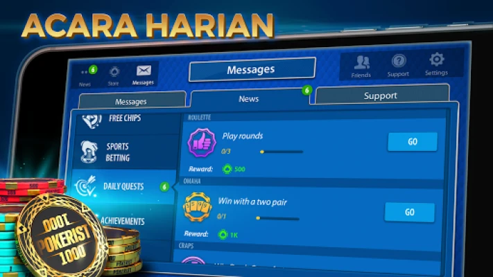 Selain keseronokan poker, Pokerist menawarkan platform sosial untuk berhubung dengan komuniti pemain dari seluruh dunia. Berinteraksi melalui sembang dalam permainan, bertukar-tukar strategi, atau sekadar berbual sambil menikmati permainan. Dipersembahkan oleh Wise Wave Corporation Limited, kami menjamin pengalaman yang adil dan selamat dengan algoritma canggih dan protokol keselamatan terkini. Jika anda mencari lebih daripada Texas Hold'em, Pokerist turut menampilkan permainan kasino 3D lain yang mengujakan seperti Blackjack, Omaha Poker, dan pelbagai mesin Video Poker klasik, menjanjikan hiburan tanpa batas. Pokerist adalah untuk tujuan hiburan sahaja dan tidak melibatkan perjudian wang sebenar.