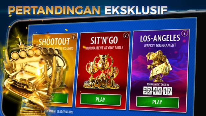 Uji kemahiran strategik anda dalam pelbagai kejohanan kompetitif yang ditawarkan oleh Pokerist. Daripada cabaran pantas Sit'n'Go dan event Boost Poker yang dinamik, sehinggalah kejohanan berbilang meja (MTT) yang sengit, sentiasa ada medan pertarungan yang sesuai untuk setiap tahap pemain. Daki papan juara global dan buktikan kehebatan anda di kalangan pemain terbaik. Inginkan sesuatu yang di luar kebiasaan? Terokai meja Poker Party kami yang inovatif, di mana peraturan tradisional Texas Hold'em disisihkan untuk keseronokan baharu yang menampilkan kad joker dan kuasa rahsia, menjanjikan putaran yang tidak dijangka dan penuh strategi unik.