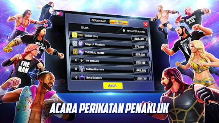 Sertai perlawanan TAG-TEAM yang mendebarkan dan libatkan diri dalam Acara Mingguan yang selari dengan pertunjukan WWE Langsung global, termasuk RAW Malam Isnin, SmackDown Live, dan acara PPV Clash of Champions. Buktikan kehebatan anda dengan membina pertahanan yang kukuh dan mencabar rakan-rakan anda dalam Mod Versus yang kompetitif. Bekerjasama dengan 'Mayhemer' lain untuk membentuk Perikatan yang kuat, menakluki Quest unik dan pertempuran dalam jalan cerita klasik WWE, serta bersaing dalam Acara Perikatan untuk ganjaran eksklusif. Matlamat utama anda? Untuk merangkul Gelaran Kejuaraan WWE, membuka peti harta karun untuk watak baharu, emas, peningkatan, dan Superstar yang lebih hebat lagi dalam WWE Mayhem.